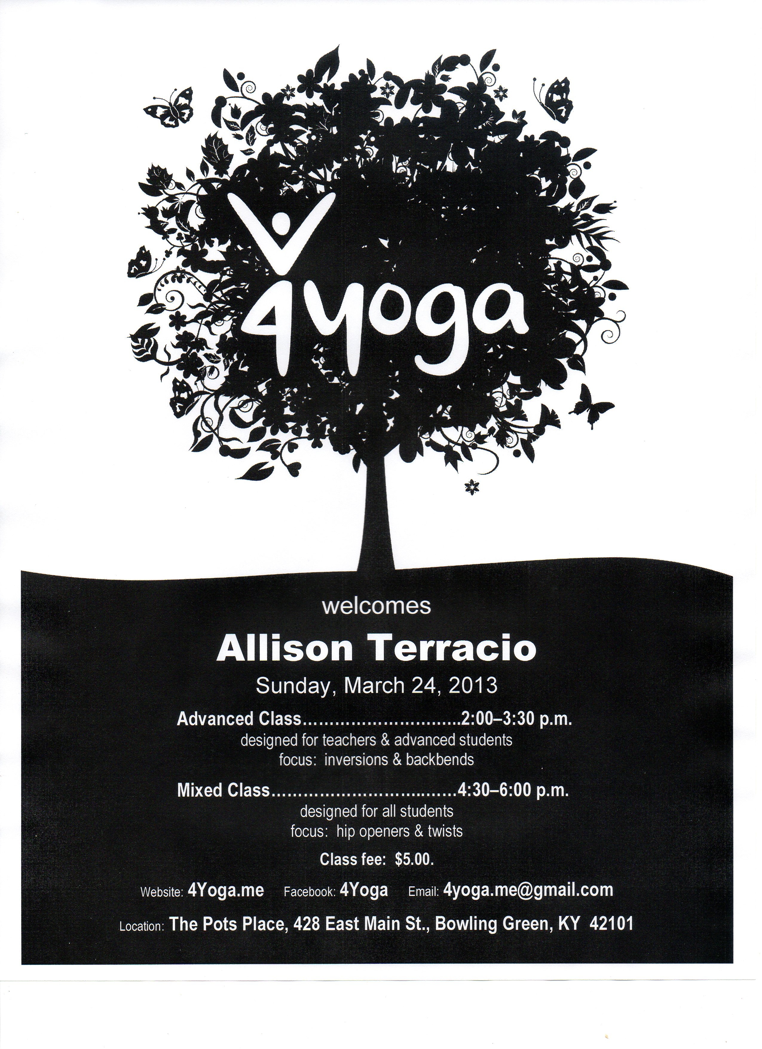 We are excited to announce another opportunity to study with a guest teacher this month! Allison Terracio will visit 4yoga on Sunday, March 24, and will offer two classes, as listed below and on the flyer.