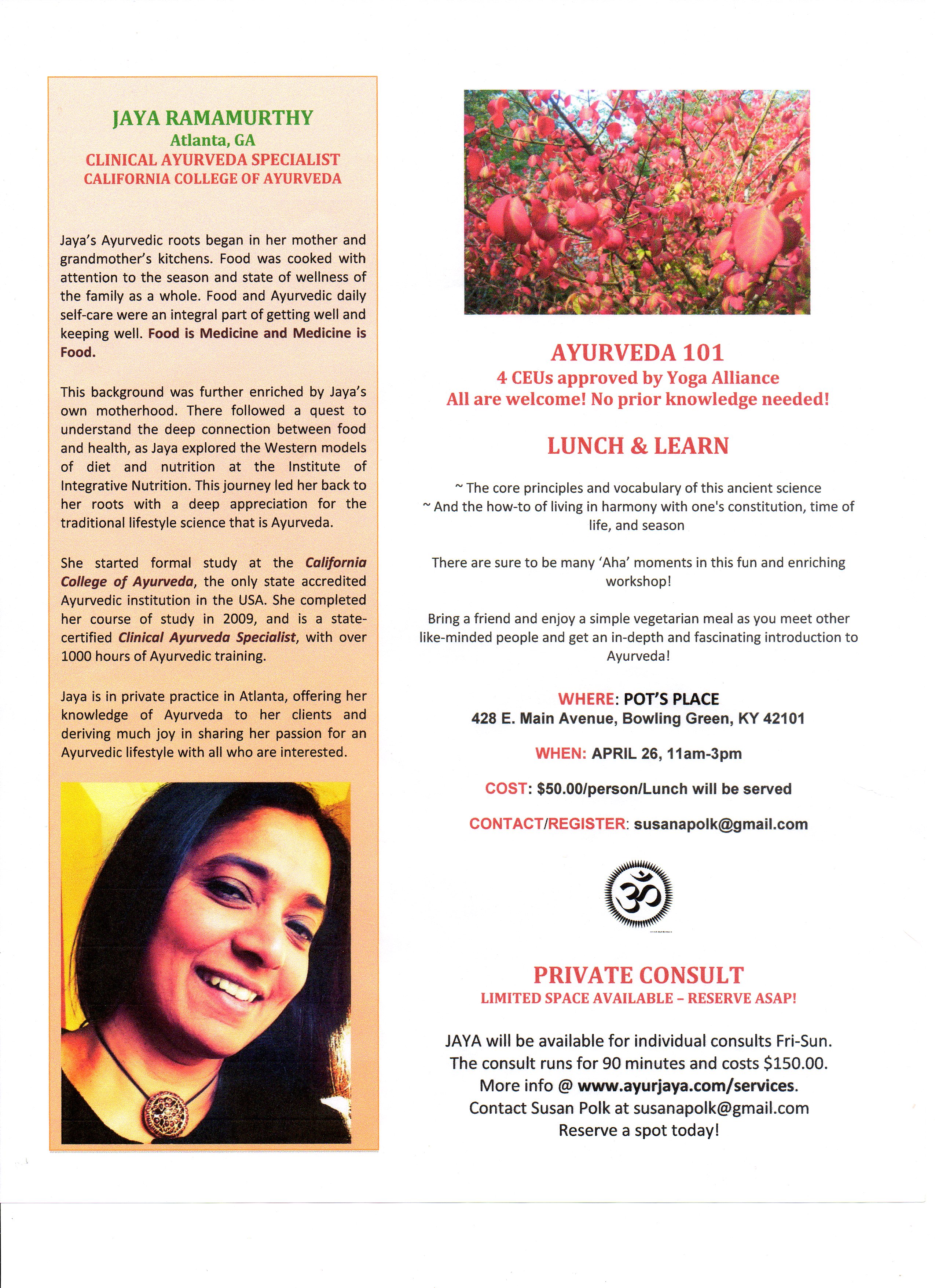 Ayurveda 101: a lunch & learn workshop on Sat., 4/26, 11 a.m.–3 p.m.