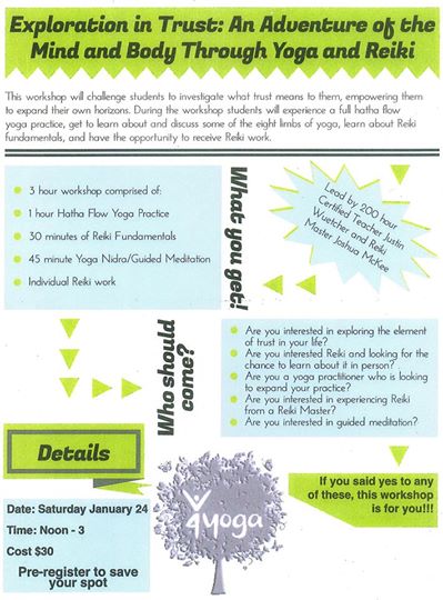 Are you interested in attending this yoga, meditation, and reiki workshop on Sat., January 24, from noon–3 p.m.? If so, please pre-register by signing up at the studio or sending us an email at 4yoga.me@gmail.com.