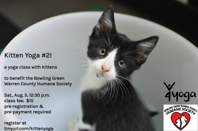 We are excited to announce a pair of special classes to benefit the Bowling Green Warren County Humane Society! On Sat., Aug. 5, Cassandra will lead students in a yoga practice with our special guests, felines from the shelter.