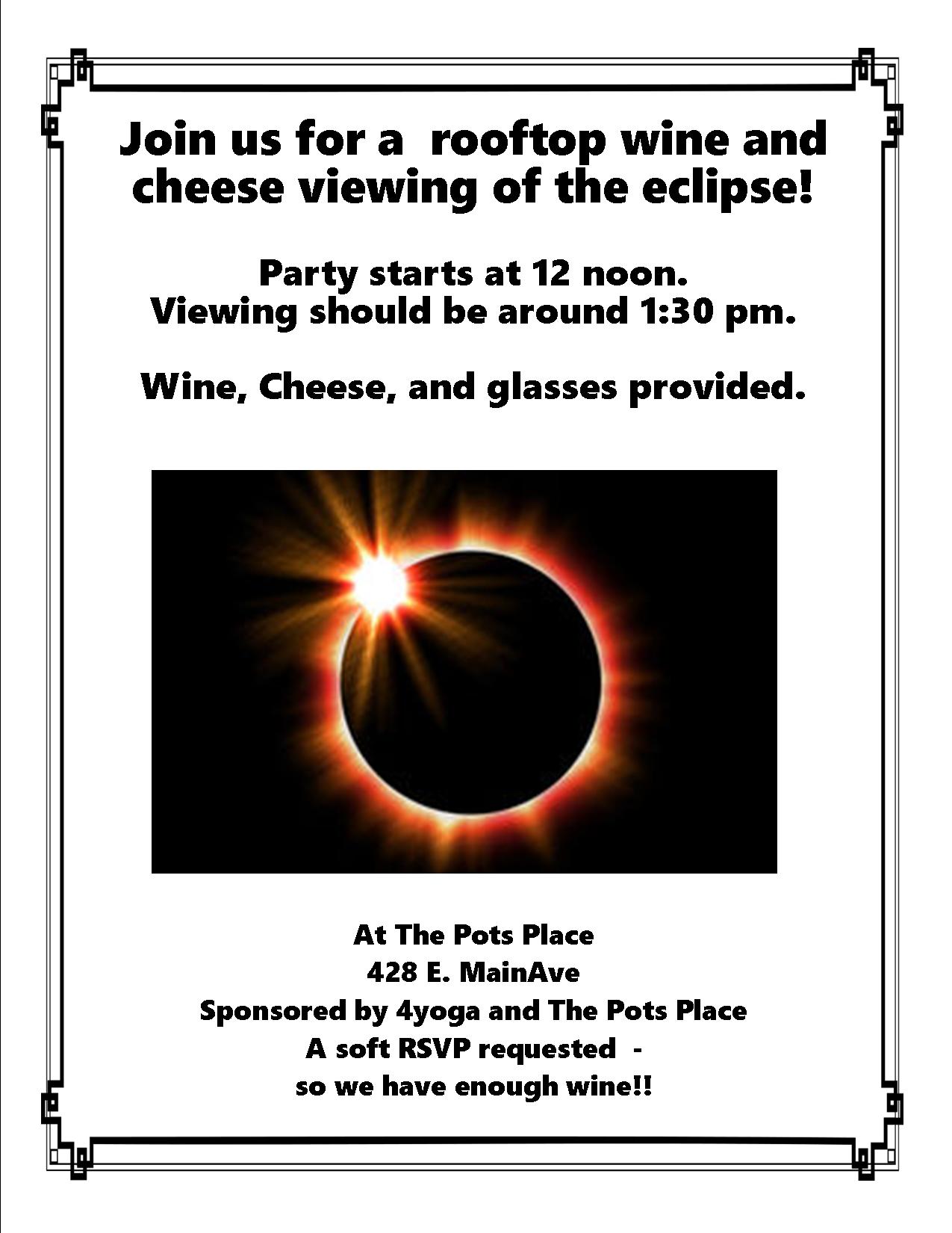 If you are looking for a place to view totality, please join us on the deck off the lounge at The Pots Place on Mon., August 21! Kathie is generously providing wine, cheese, and viewers; you are welcome to bring a dish or beverage to share or just to bring yourself. We will begin gathering at noon, and totality will begin at 1:27:23.