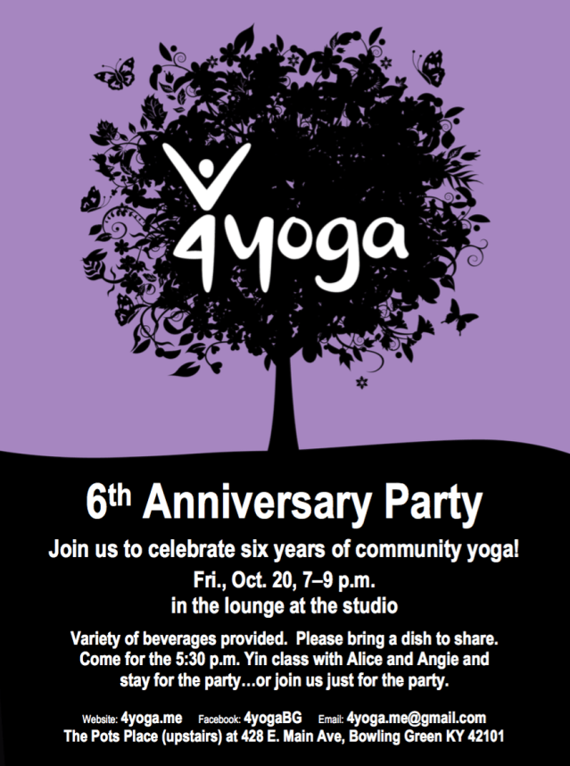 On Friday evening, we are gathering to mark six years of 4yoga! Whether you have been with us from the first class at Dance Images, back on September 27, 2011, or just joined us recently, we hope you can attend and celebrate with the members of our yoga community.