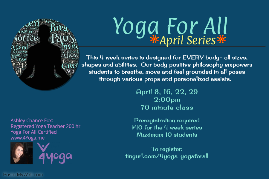 Original post: We are excited to announce that registration for the 4-week April Yoga for All series is now open! The first class meets on Sunday, April 8—see the flyer below for more details, and use this registration form to sign up!