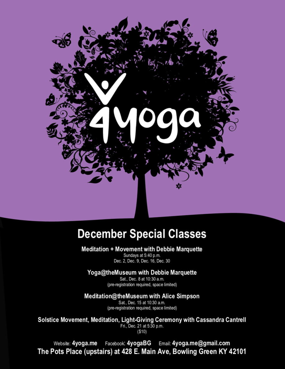 - Yoga and Meditation at The Downing Museum. In December, Debbie will teach the Yoga@the Museum class on Sat., Dec. 8, and Alice will lead the Meditation@the Museum session on Sat., Dec. 15. Both classes meet at The Downing Museum at 10:30 a.m. For details and to register, follow the links above—both classes are filling fast, so please sign up soon.