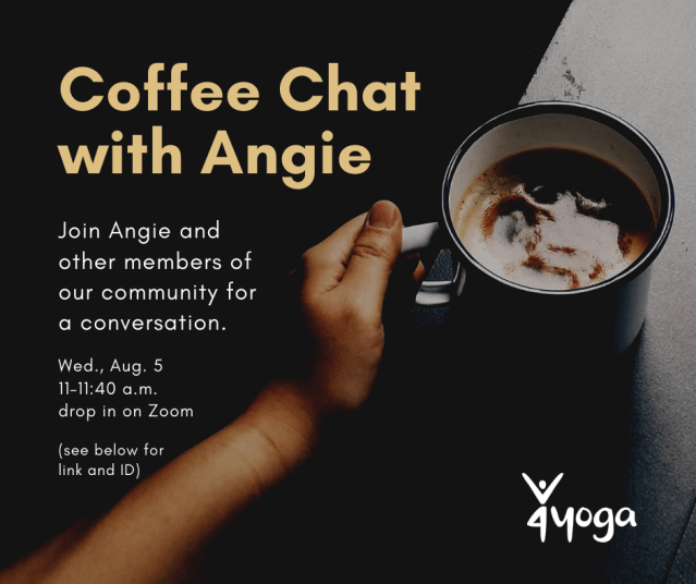 If, like Angie, you are missing the casual conversations before and after classes, please join her on Zoom on Wed., Aug. 5, at 11 a.m. No real agenda—just a chance to reconnect—but she would especially welcome your ideas about how 4yoga can continue supporting our community in the months ahead.