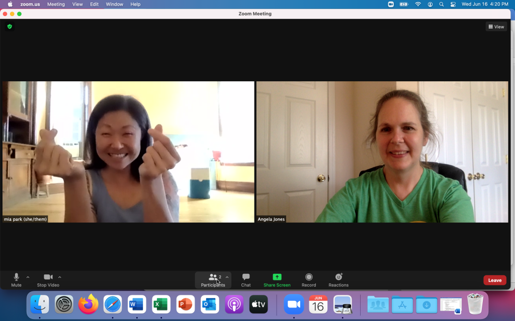 Angie especially appreciated the many opportunities to practice teach with her classmates via Zoom’s breakout room function. She was paired with students from as far away as Wichita, Kansas, and Buffalo, New York, and all classmates provided kind and valuable feedback. In addition, each participant was able to hold a one-on-one meeting with Mia and to join a private Facebook group to continue exchanging ideas.