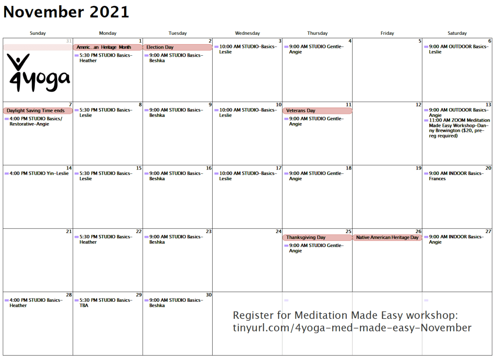 Happy November! We look forward to practicing with you this month, where most of our yoga classes will meet in the studio and we bring back a Sunday afternoon yoga class for three Sundays! To make it easy to join us whenever your schedule allows, no pre-registration for yoga is needed: classes are all drop-in and $10.