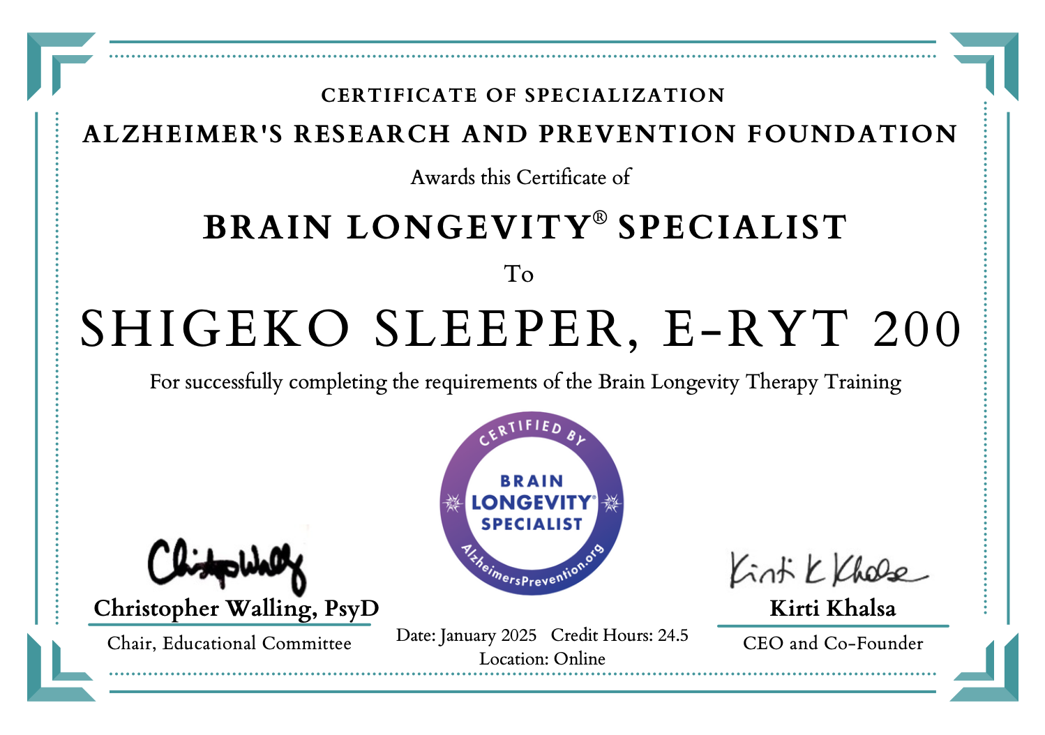 We are excited to announce that Shigeko Sleeper has completed the Brain Longevity Therapy Training provided by the Alzheimer’s Research and Prevention Foundation (ARPF)! Shigeko took this 24.5-hour online training in December 2024. The lead trainer for this asynchronous course is Dr. Chris Walling, who, in addition to his academic training as a psychologist, is a yoga therapist.