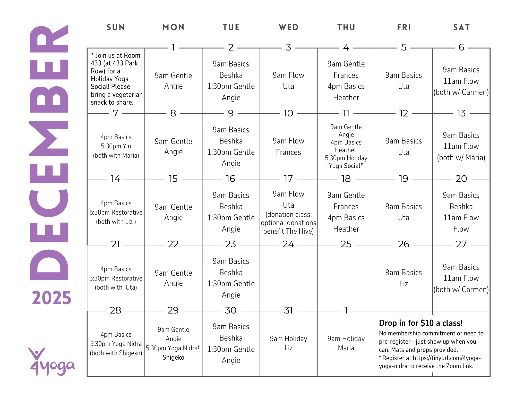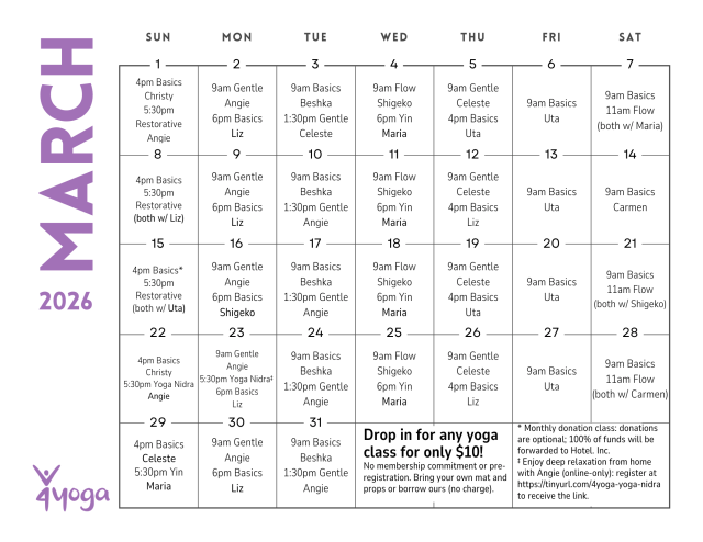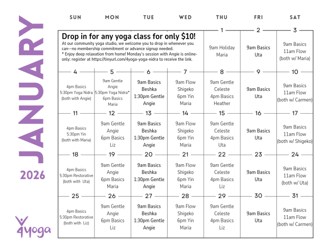 To see details about each class, including teachers’ names and concluding times, please click on that class listing in the embedded calendar below: this version of our schedule is always the most updated, including any substitute teachers or, in rare cases, cancelations. For an overview of the month’s schedule as published at the beginning of the month, just scroll to the image.